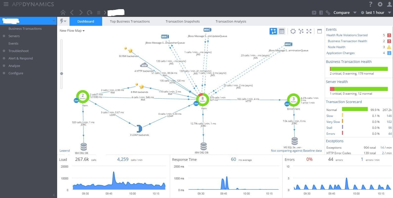 The main use case of an APM tool is to monitor the performance of an application. You want comprehensive dashboards that show you at a glance how your application is performing. AppDynamics provides excellent dashboards out of the box which do just this. One example is the dashboard above, just focus on the graphs and tables on the right and bottom sides of the screen which provide the most relevant performance information. Additionally, AppDynamics offers many possibilities to construct custom dashboards according to your own needs and wishes.