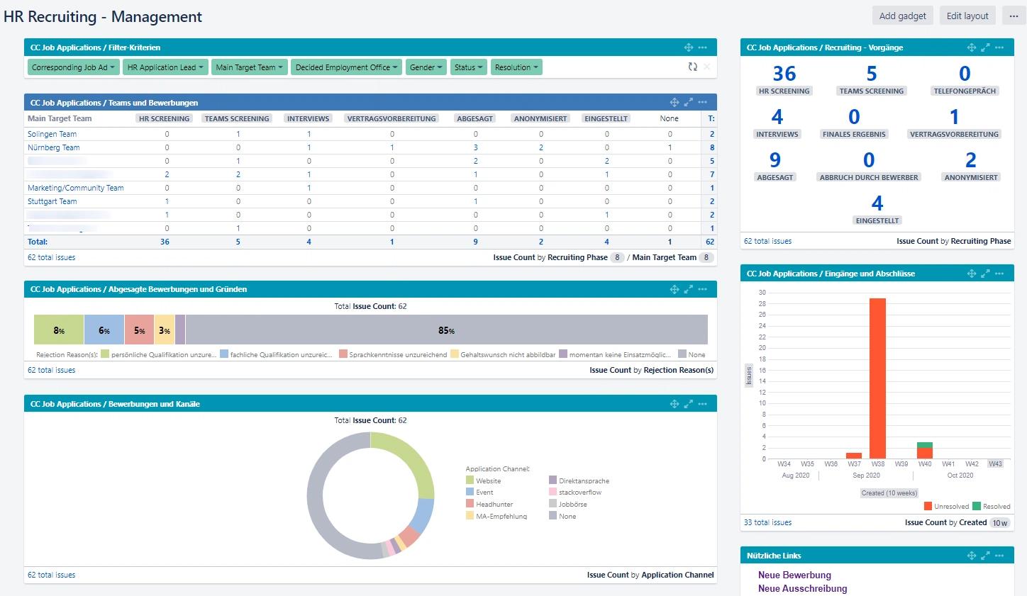 Wir verwenden Jira als Infrastruktur für Workflow-Engine, Benutzer-, Berechtigungs- und Berichtsmanagement. Hiermit passen wir verschiedene miteinander verbundene (verschachtelte) Workflows an, um eine individualisierte Lösung zu schaffen, die den organisatorischen, rechtlichen und technischen Anforderungen eines Unternehmens entspricht. Anhand verschiedener Add-Ons haben wir eine Landschaft geschaffen, auf der Personalabteilungen Recruiting-, Vertragsmanagement- und On-Boarding-Prozesse integriert abwickeln können. Das Management hat außerdem einen direkten Zugriff auf Dashboards. Statistiken und Status-Informationen. Diese sind frei gestaltbar, je nachdem, welche Einblicke die Entscheidungsträger benötigen und welches Cockpit ein HR-Mitarbeiter benötigt, um seine tägliche Arbeit effizient bewältigen zu können.