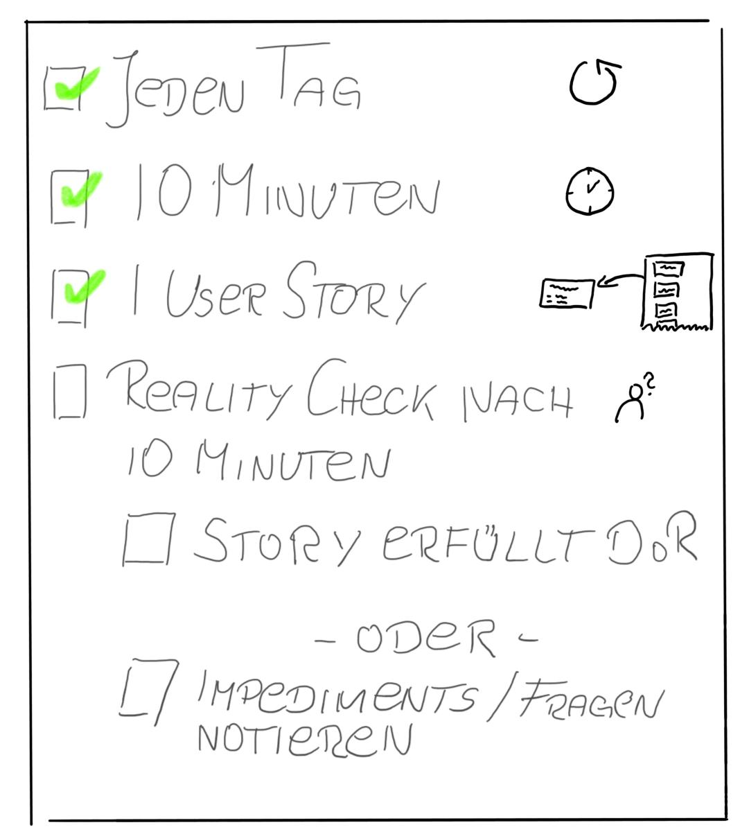 - Es wird genau ein Item bearbeitet. Ist die Story schnell bearbeitet, kann direkt zur täglichen Arbeit übergegangen werden.