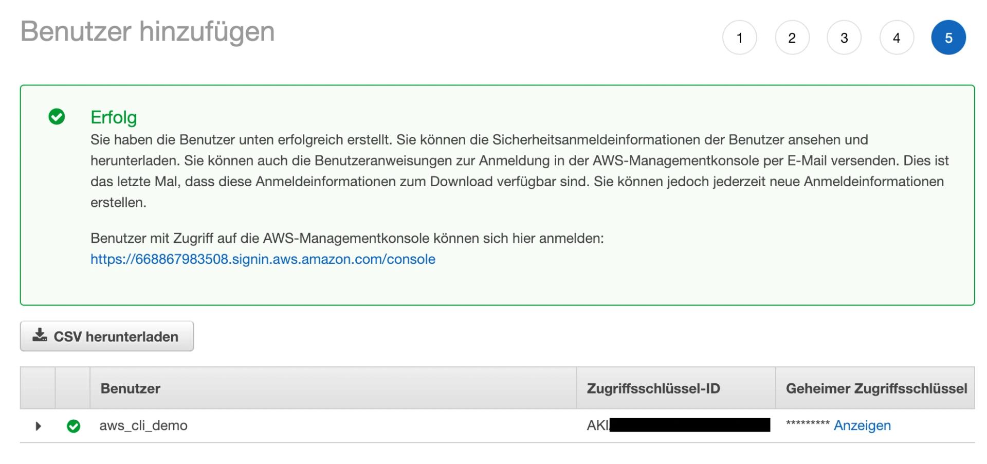 Überspringt die Tags und erstellt im letzten Bildschirm des Wizards den Benutzer. Wenn der Benutzer angelegt wurde, erhaltet ihr im folgenden Bildschirm die Zugangsdaten des Benutzers die wir für die CLI benötigen. Am besten ladet ihr euch diese als CSV-Datei herunter und speichert sie lokal an einem sicheren Ort ab.