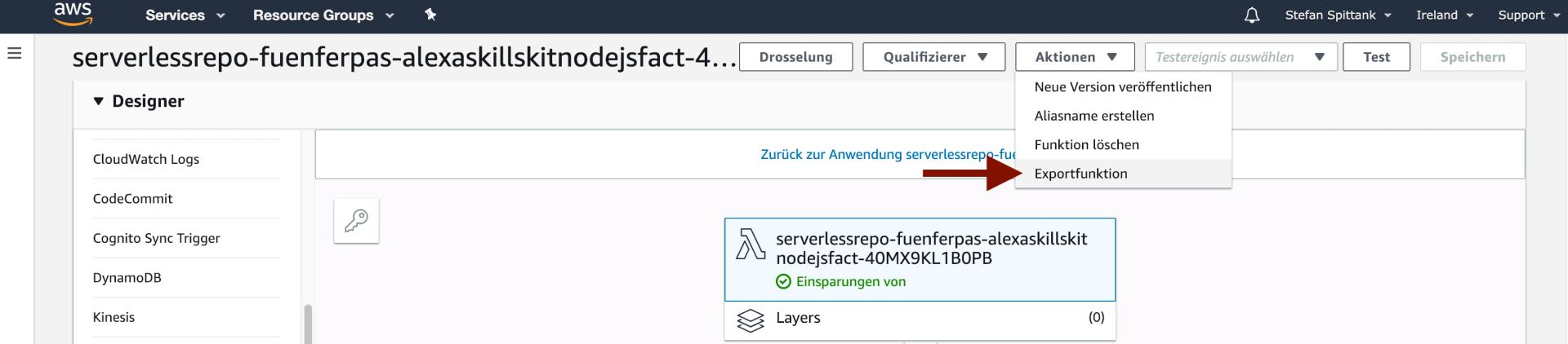 Alternativ kann man auch eine Zip-Datei der Lambda (inkl. des node_module Verzeichnisses) herunterladen. Dafür im Header unter Aktionen den Eintrag “Exportfunktion” auswählen: