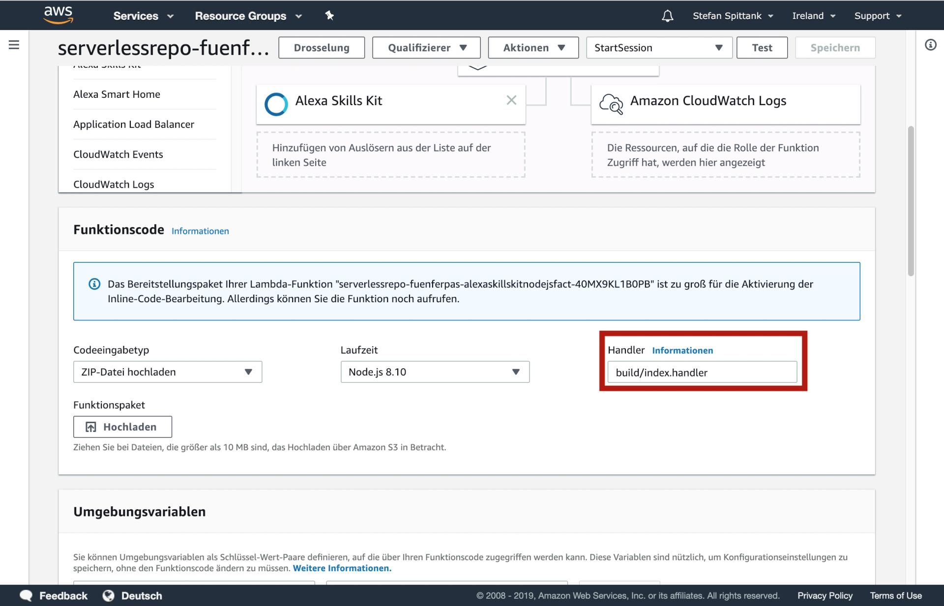 Durch die geänderte Verzeichnisstruktur liegt aber nun auch die generierter Lambda-Funktion an einer anderen Stelle. Dies müssen wir auch in der Lambda-Konfiguration in der Cloud anpassen, sonst wird bei der Ausführung immer noch am ursprünglichen Ort gesucht. Dazu öffnen wir die Lambda Management Console , wählen aus der Liste der Lambda-Funktionen die Funktion zu unserem Skill aus und passen im Folgenden den Handler an: