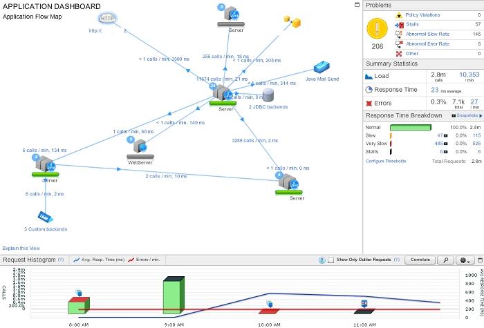 - Der größte Bereich ist die sogenannte „Application Flow Map“. AppDynamics erkennt alle Server automatisch und überwacht ihre Kommunikation miteinander.