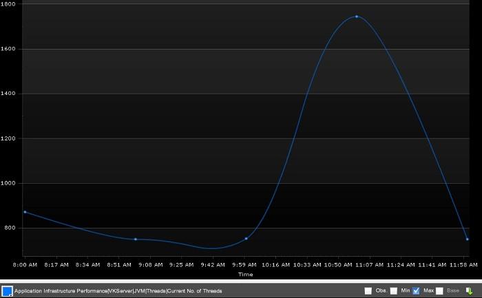 Dieser Fehler ist in der Tat sehr interessant. Ausfälle mit einem solchen Fehler deuten eher auf Konfigurationsprobleme oder einem Fehler beim Threadmanagement hin, nicht auf inperformanten Code. Also schaute ich mir die Anzahl der Threads an, welche AppDynamics mitgemessen hat: