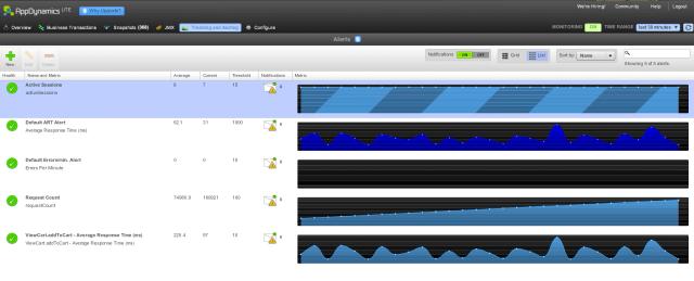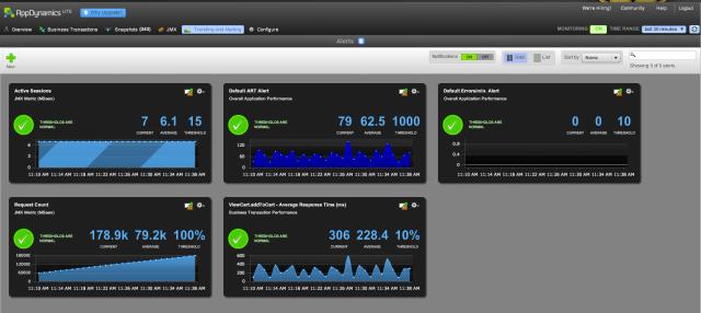 2. Die Möglichkeit eigene Alerts inkl. e-Mail Benachrichtigung einzurichten. Hier gebe ich lediglich an, welche Metrik ich überwachen will, also z.B. die Antwortzeit meiner Kunden-Such Transaktionen, welches der kritische Schwellwert ist (absolut oder prozentual zur Durchschnittsantwortzeit) und optional wer die e-Mail bekommen soll. Das Ergebnis ist eine kleine Kachel auf dem Alerting Dashboard, welches mir den Zustand (rot, gelb, grün) und die Werte anzeigt. Wahlweise kann ich mir die Alerts auch als Liste anzeigen lassen.