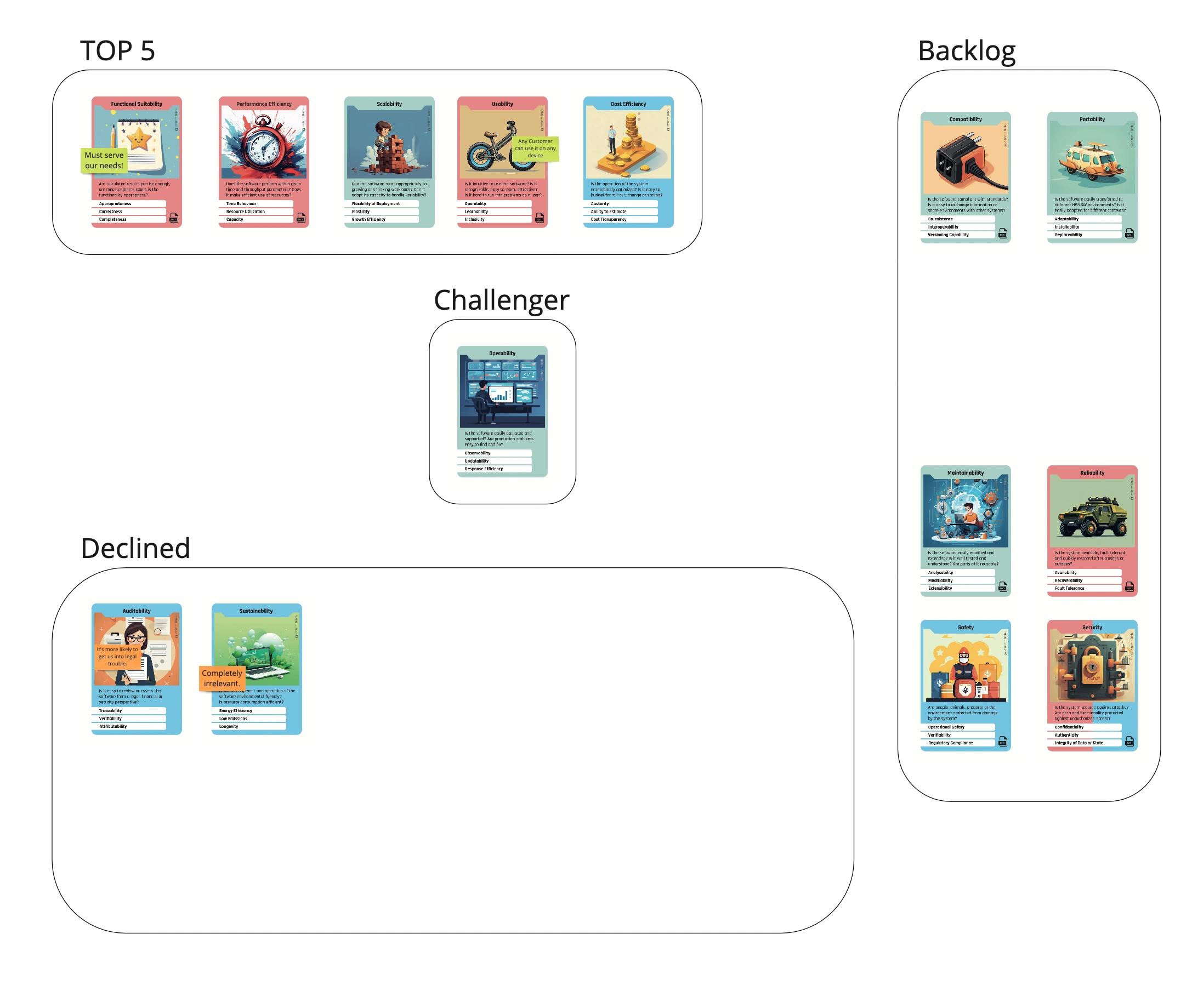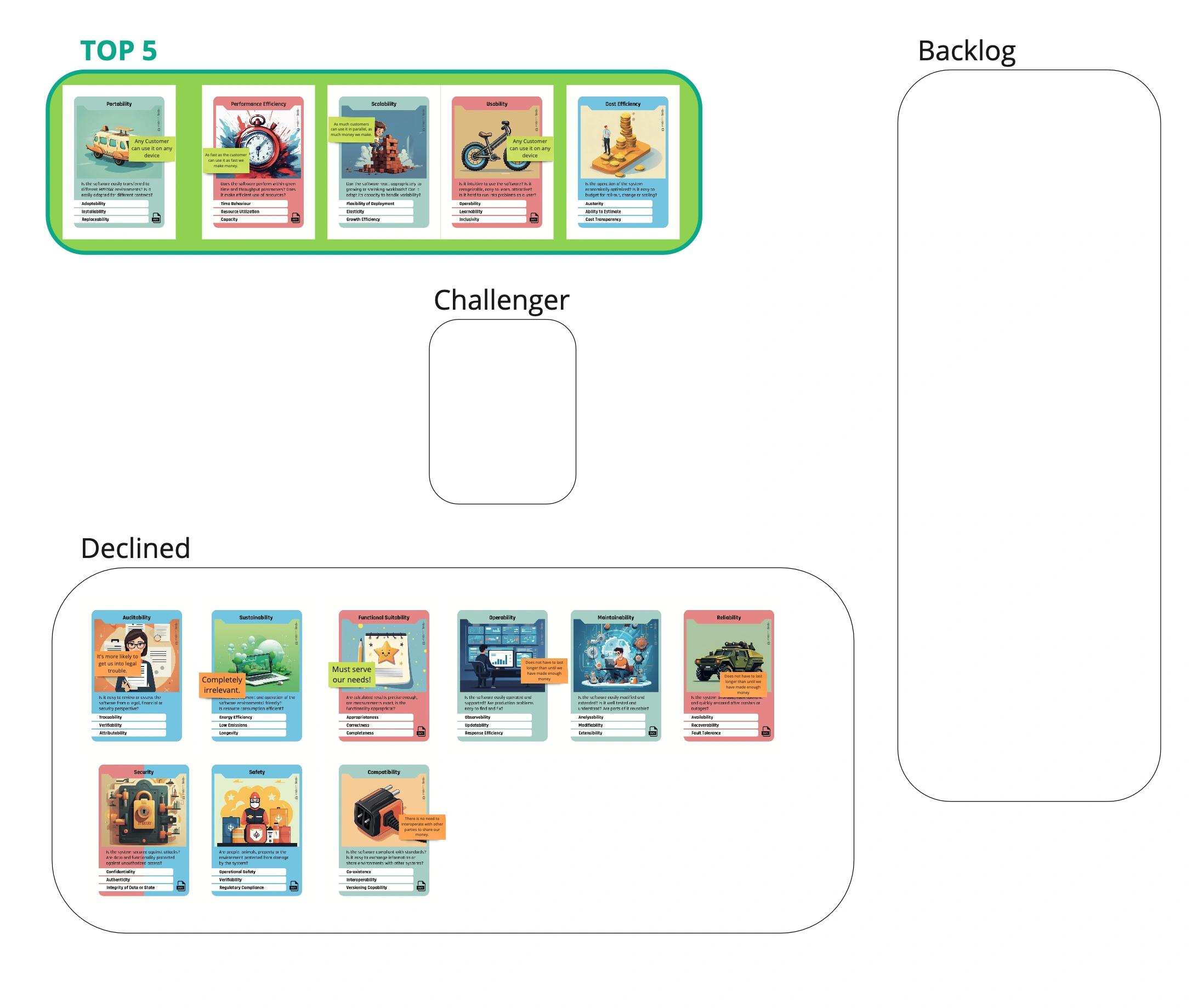 - Am Ende jeder Runde wird ein Qualitätsziel in den Bereich „Declined“ gestellt, unabhängig davon, ob es ein „Challenger“ oder ein verdrängtes Qualitätsziel war.