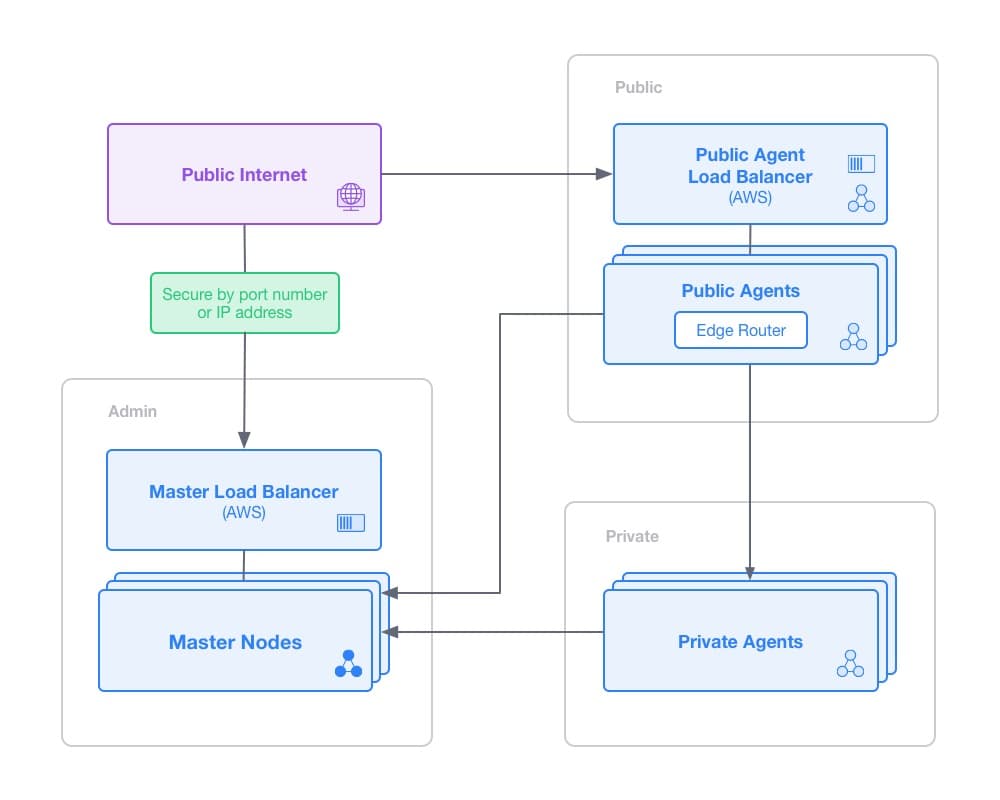 Die Standard-Installation von DC/OS erstellt eine Netzwerktopologie, die aus drei Zonen besteht. Es gibt eine Admin-, eine private und eine öffentliche Zone. Die Admin-Zone ist vom Internet über HTTP/HTTPS und SSH-Verbindungen erreichbar und stellt den Zugriff auf die Master-Knoten sicher. Außerdem kann man von dieser Zone aus auf die anderen Knoten zugreifen.