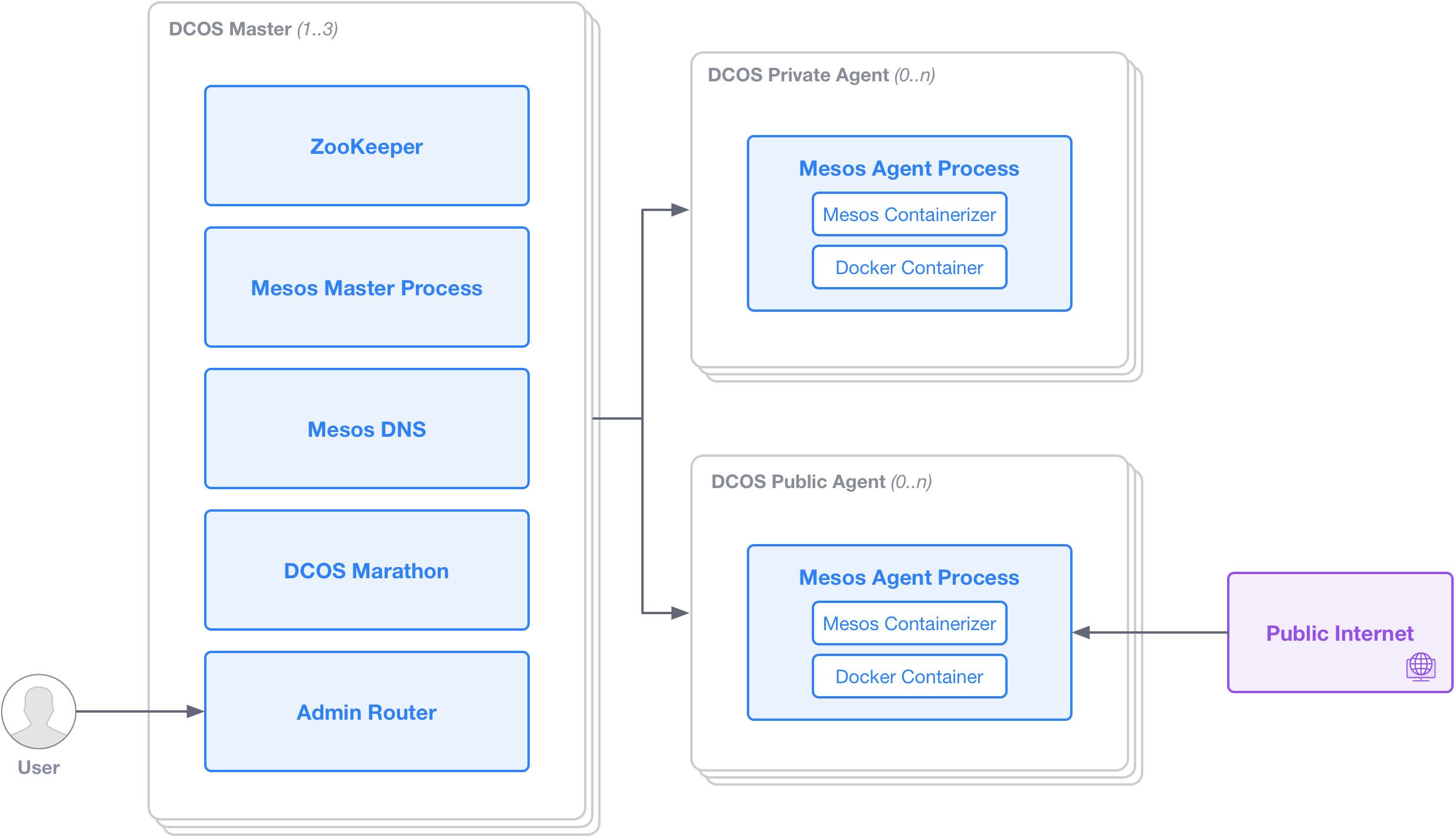 DC/OS besteht aus unterschiedlichen Knotentypen. Es existieren Master- und Agenten-Knoten. Auf den Master-Knoten sind die folgenden Komponenten installiert: