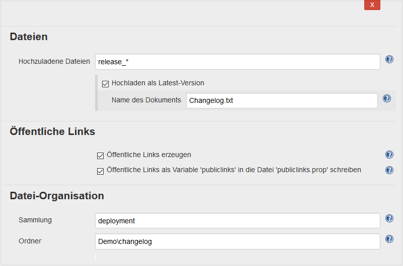 - Hochladen als Latest-Version: Diese Option erlaubt es, eine Datei als neue Version einer vorhandenen Datei hochzuladen. Das Pattern „Hochzuladene Dateien“ darf dazu nur genau eine Datei beschreiben. Existiert die Datei noch nicht, wird eine erste neue angelegt.