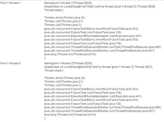 Für den folgenden kurzen Screencast habe ich das „Dining Philosophers“ Problem genutzt, welches in einer abgewandelten Variante von Dr. Heinz Kabutz in seinem letzten Newsletter behandelt wurde. Heinz war kürzlich mit seinem Java Specialists Master Course bei codecentric in Düsseldorf und hat mir davon erzählt. Ich hatte schon länger vor das Feature zu demonstrieren, nur nie Zeit ein Deadlock zu programmieren. Danke Heinz 🙂