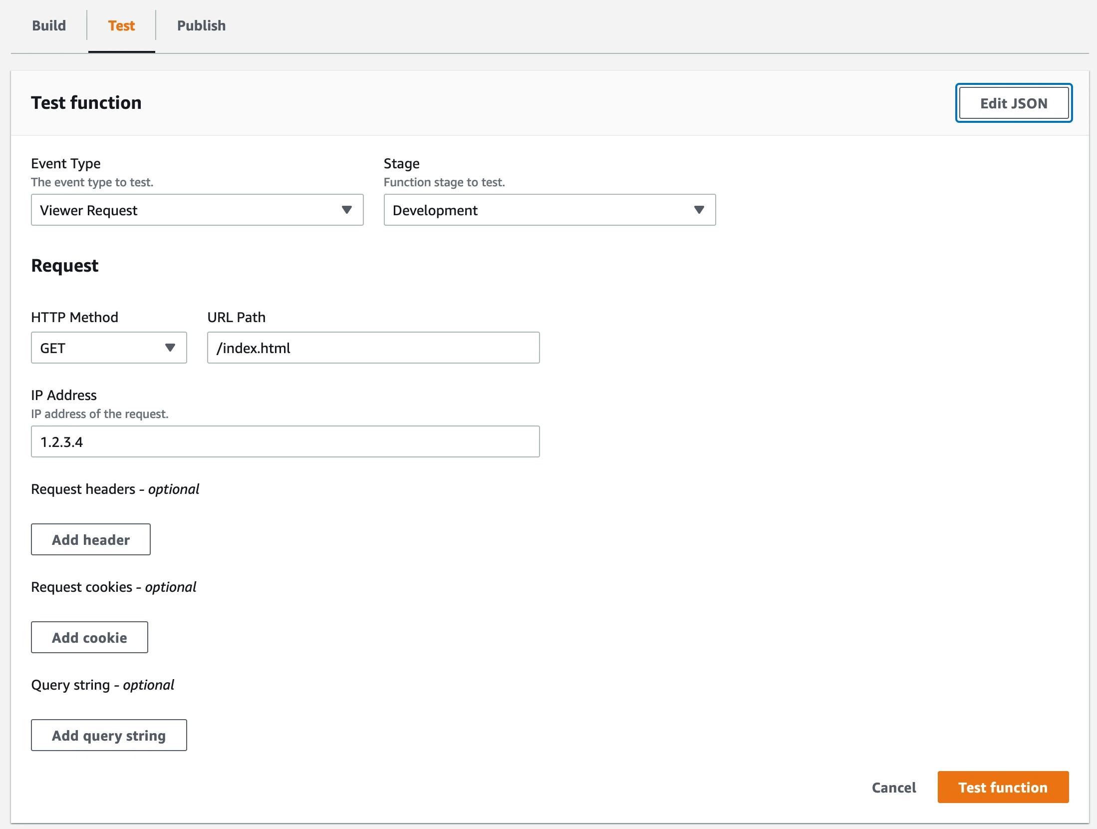 kein Problem, da lediglich der Pfad zur JavaScript-Datei benötigt wird. Wenn wir die Funktion aber mit Unit-Tests absichern wollen, stoßen wir auf Probleme. Amazon bietet zwar die Möglichkeit, CloudFront Functions manuell in der AWS-Konsole zu testen. Dies kann automatisierte Tests allerdings nicht ersetzen.