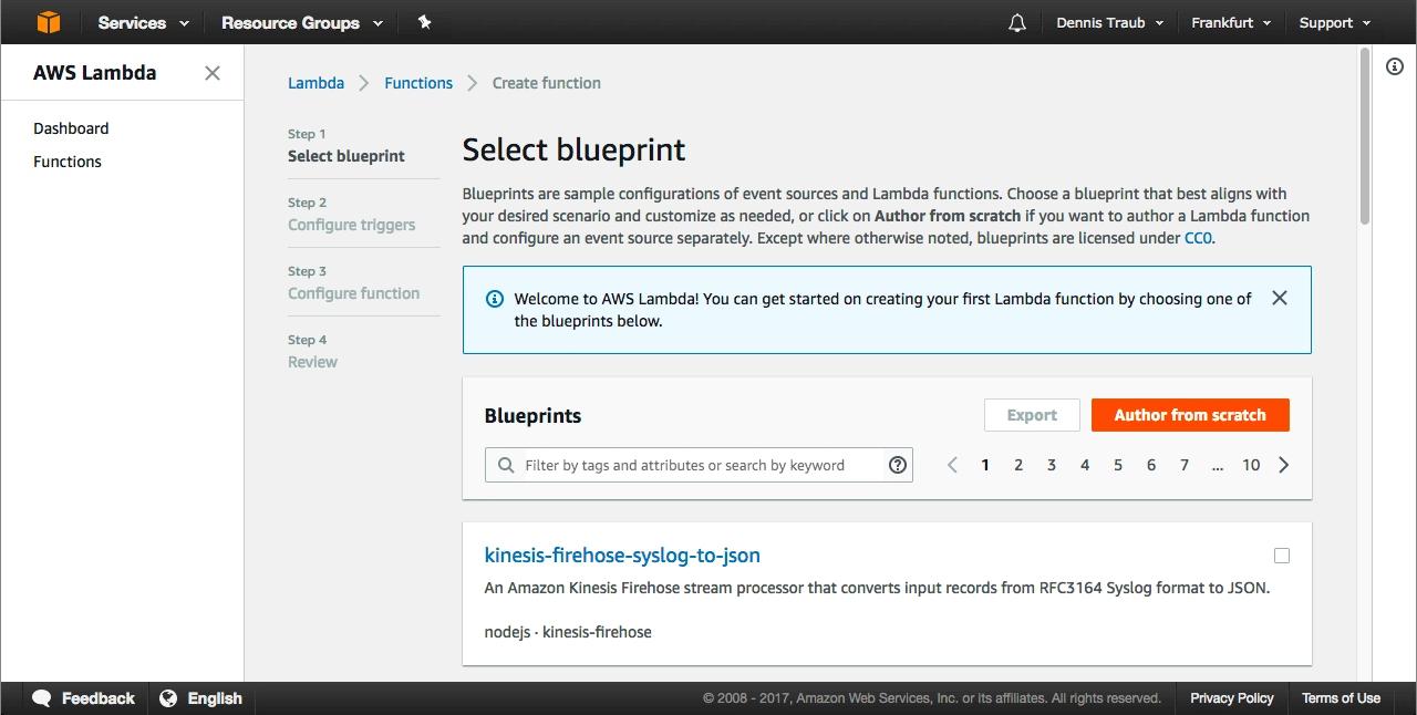 Mit einem Klick auf „Get Started Now“ beginnst du die Erstellung deiner ersten Lambda-Funktion. Diese besteht aus drei Schritten, durch die ich in den kommenden Abschnitte führe.