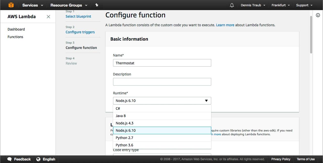 Jetzt bist du bei der Konfiguration der eigentlichen Lambda-Funktion angelangt. Hier kannst du deiner Funktion einen Namen geben – in unserem Beispiel „Thermostat“ – und eine Runtime auswählen, in der der Code ausgeführt werden soll. Hier stehen dir C#, Java, Node.js und Python zur Verfügung (Stand Juli 2017). Wir schreiben unser Beispiel in JavaScript, d.h. du kannst hier Node.js 6.10 auswählen: