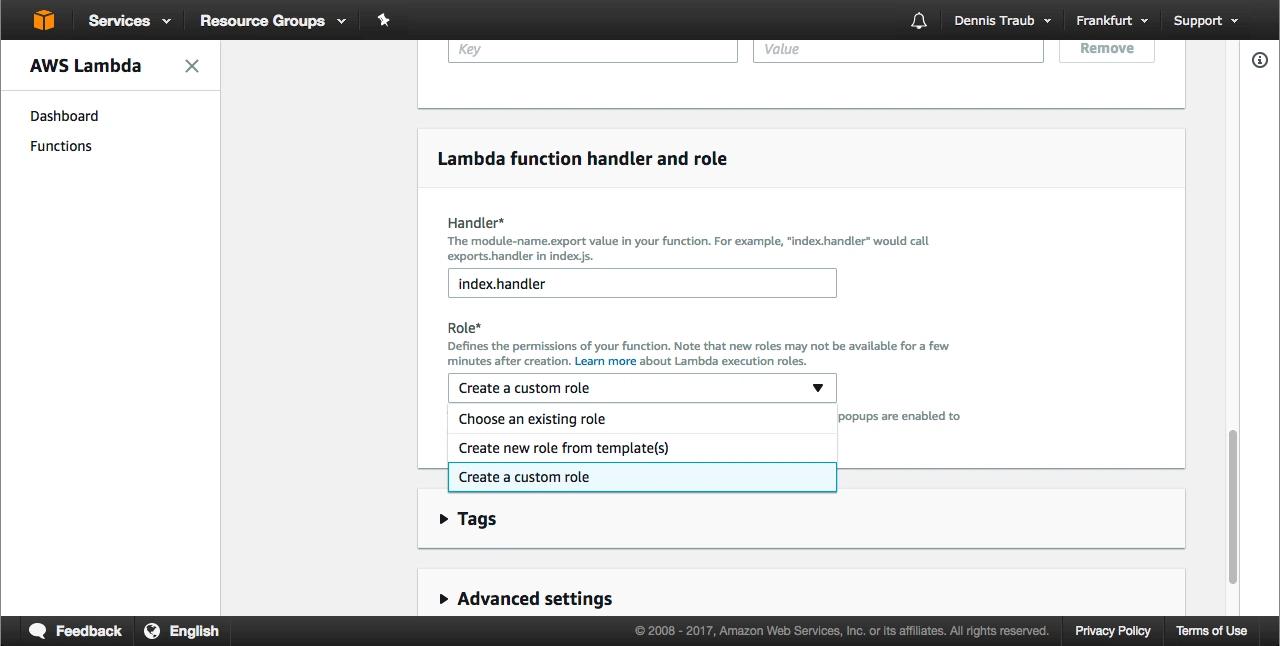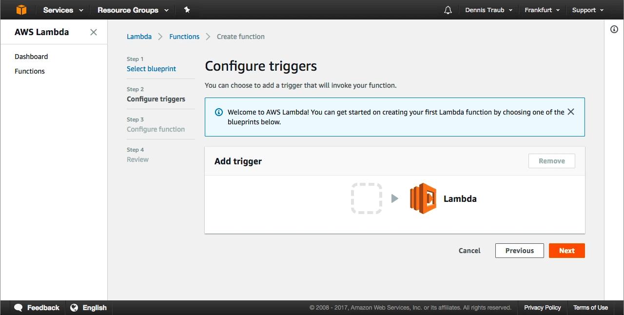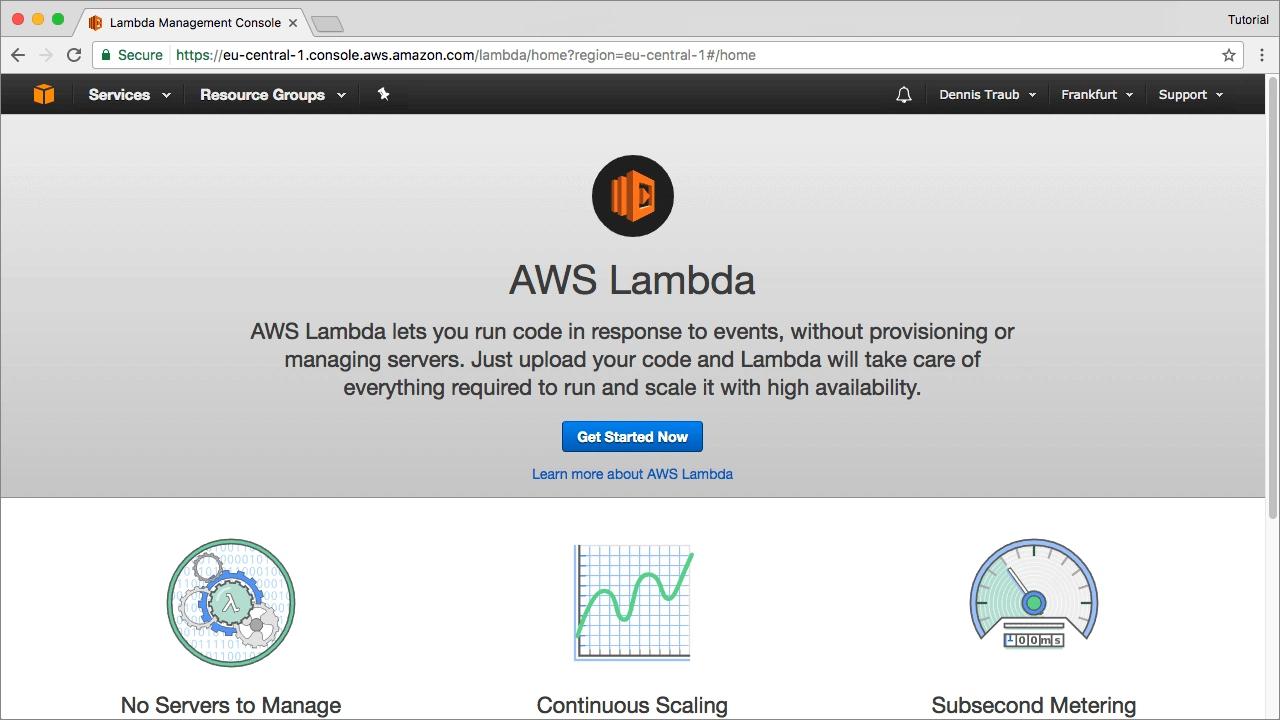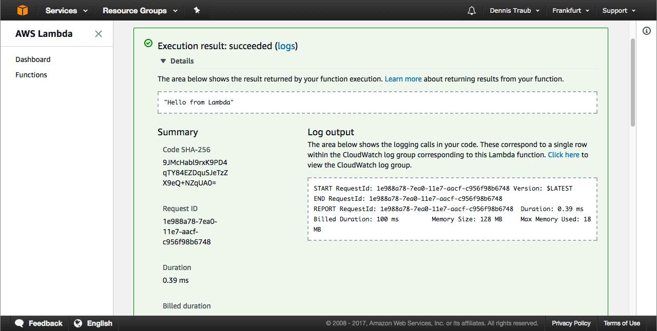 Update: Die Web-Konsole für AWS Lambda hat seit dem 11. August 2017 eine neue Benutzeroberfläche. Diesen Artikel und die Screenshots habe ich entprechend angepasst.