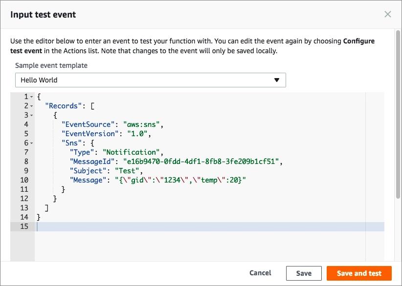 1{ 2 "Records": [ 3 { 4 "EventSource": "aws:sns", 5 "EventVersion": "1.0", 6 "Sns": { 7 "Type": "Notification", 8 "MessageId": "e16b9470-0fdd-4df1-8fb8-3fe209b1cf51", 9 "Subject": "Test", 10 "Message": "{\"gid\":\"1234\",\"temp\":20}" 11 } 12 } 13 ] 14}
