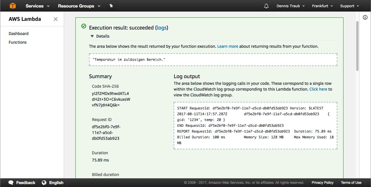 Mit „Save and test“ schickst du es schließlich an die Lambda-Funktion. Wenn alle Eingaben richtig waren, dann solltest du nach einer kurzen Verarbeitungszeit die folgende Ausgabe sehen: