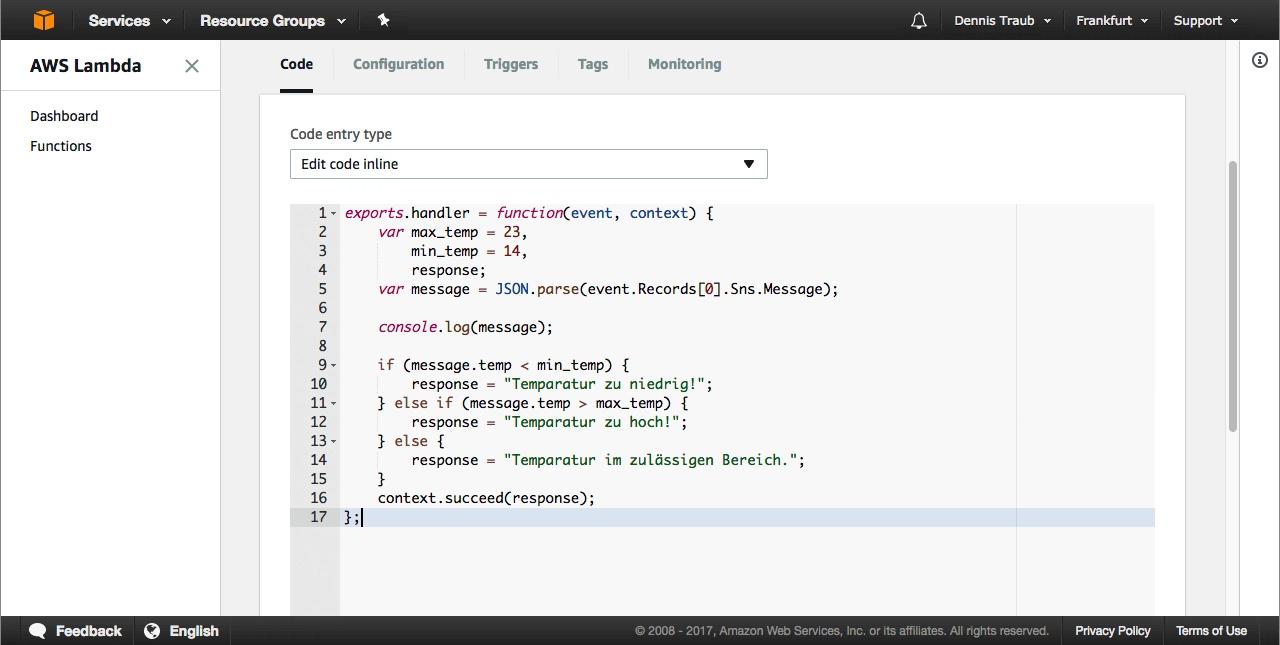 Die Funktion besteht aus einem einfachen Handler, der ein Event von einem Thermometer erwartet. Dieses (in unserem Beispiel simulierte) Thermometer versendet seine Events via den AWS-eigenen Benachrichtigungsdienst Amazon Simple Notification Service (SNS) .