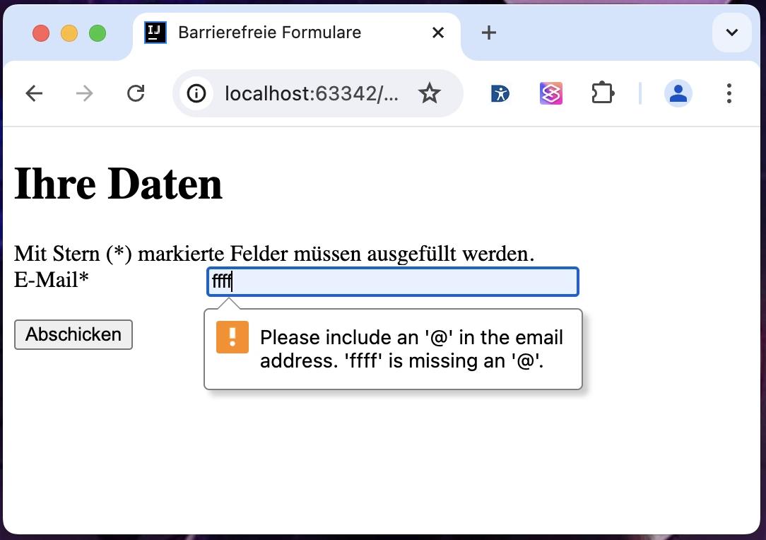 Darüber hinaus kann der Browser aber noch mehr: wir haben angegeben, dass das Feld vom Typ E-Mail ist. Das führt dazu, dass die Eingabe automatisch auf eine valide E-Mail-Adresse überprüft wird, wie im nächsten Screenshot zu sehen: