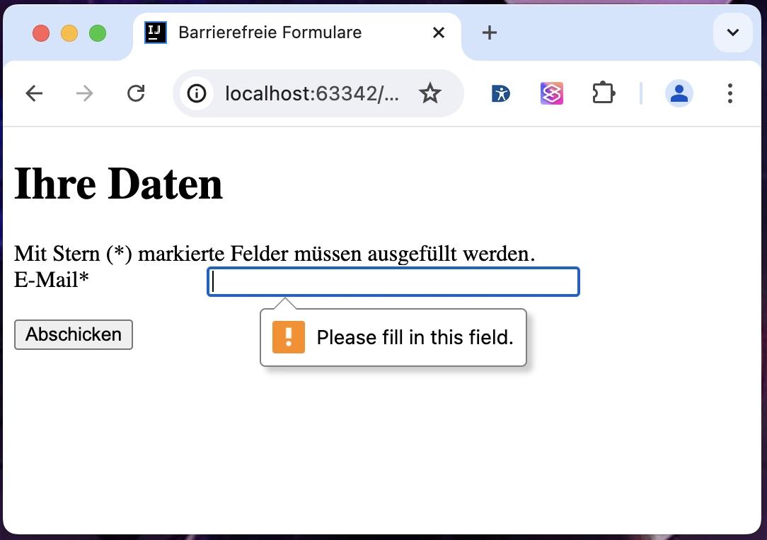 Durch die Verwendung des required-Attributs erhalten wir automatisch eine Validierung durch den Browser. Sie wird ausgelöst beim Absenden des Formulars und gibt uns eine Fehlermeldung in der eingestellten Browsersprache: