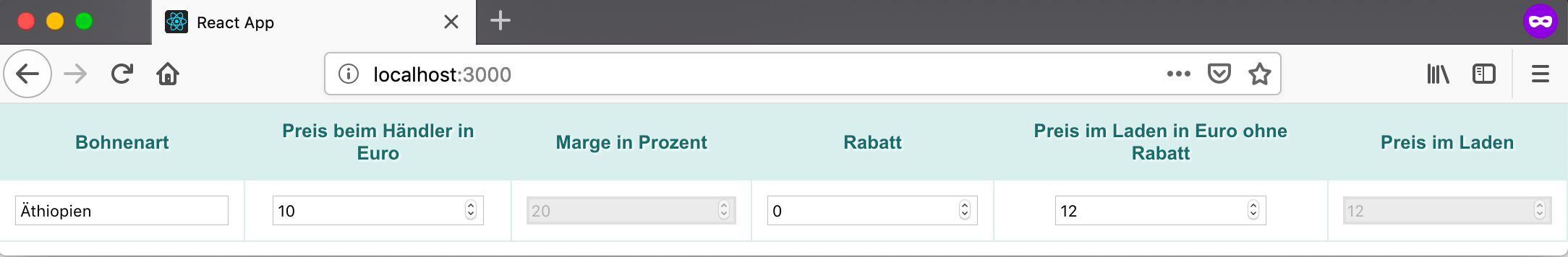 Es ist eine React-Anwendung (basierend auf Create-React-App ), die kein Backend hat. Sie enthält aber clientseitig eine (noch) recht einfache Logik um Preise zu berechnen, die aber schon Margen und Rabatte berücksichtigt. Dies simuliert uns den Offline-First-Fall. Die Sourcen der Anwendung findet man hier .