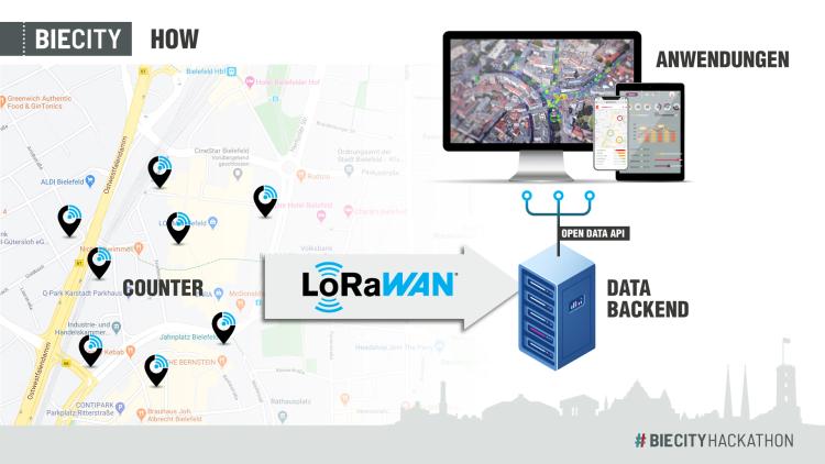 Generell basiert der Ansatz auf der Nutzung eines (inner)städtischen LoRaWans, welches die Sensoren zur Zählung der Menschen verbindet. LoRaWAN steht für Long Range Wide Area Network und ist eine energieeffiziente Funktechnologie für die Datenübertragung insbesondere von Sensoren, Zählern, oder anderen Messinstrumenten. Die reinen Zähldaten werden über ein Gateway des LoRaWans ans Backend übermittelt und stehen dort mittels Open Data API zur Verfügung, um z.B. dann auf den Webseiten in Form einer Heatmap dargestellt zu werden.