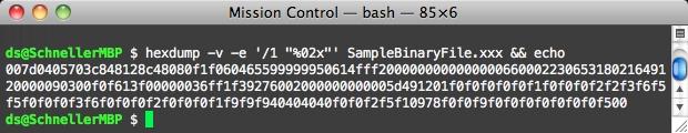 Das ist für den vorliegenden Fall schon deutlich angemessener. Eine binäre Nachricht in einen String von Hexwerten umzuwandeln ist sehr einfach. Entweder man verwendet dazu einen Editor, der das schon mitbringt – zum Beispiel den sehr nützlichen Hex Fiend (Mac) – oder man wechselt einfach auf “Die gute alte Kommandozeile”™: