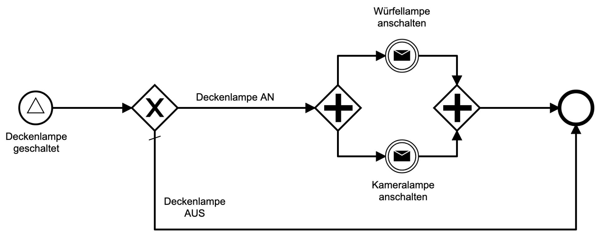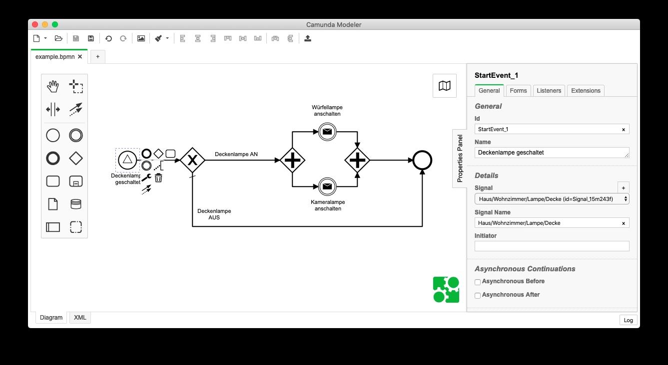 Schauen wir einmal im Detail auf die von der BPMN angebotenen Konzepte, welche für die Umsetzung eingesetzt werden können: Die BPMN bietet sowohl Messages als auch Signals an. Rein technisch betrachtet existiert zwischen den beiden Konzepten kein Unterschied, semantisch jedoch ist ein Signal einem Broadcast gleichzusetzen und eine Message ein gezielter Versand einer Nachricht an einen externen Akteur. Geht man nun davon aus, dass das Schalten einer Lampe (hier der Deckenlampe) ein von openHAB gesendeter Broadcast über den Message-Broker ist, können wir als Startereignis ein “Signal Start Event” verwenden. Soll aus der BPMN heraus eine Lampe geschaltet werden, ist dies als gerichteter Aufruf zu verstehen und lässt sich daher als Message modellieren. Heißt also: eingehende Zustandsänderungen sind Signals, ausgehende Zustandsänderungen sind Messages.