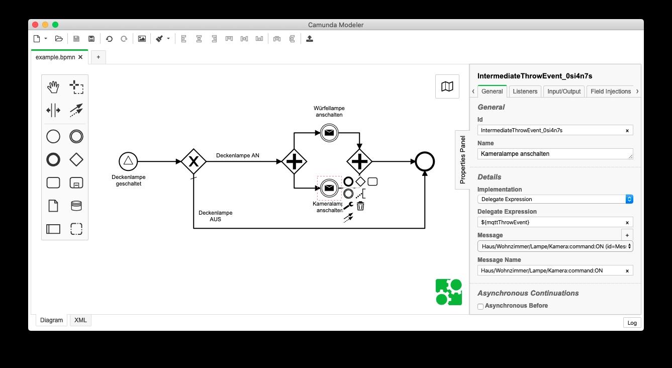 Nächster Schritt ist die Rückantwort von der BPMN an openHAB. Da es sich hier um das gezielte Senden von Nachrichten handelt, greifen wir auf “Intermediate Throw Events” zurück und geben als Message-Namen das Topic an, welches die entsprechende Lampe adressiert. Im vorliegenden Fall ist dies Haus/Wohnzimmer/Lampe/Kamera