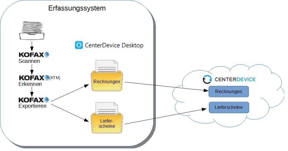 Kofax Capture automatisiert und beschleunigt Geschäftsprozesse, indem es Papierunterlagen und Formulare beliebiger Art erfasst, in zuverlässige, jederzeit abrufbare Informationen umwandelt und die Informationen an Ihre Geschäftsanwendungen, -prozesse und -Workflows – in unserem Falle an CenterDevice – übergibt. Weitere Details finden Sie hier .