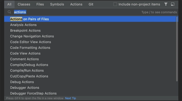Wenn du mal einen Shortcut nicht kennst, aber die Aktion trotzdem einigermaßen schnell finden und ausführen willst, denk an die Suchfunktion für Aktionen. In JetBrains-IDEs kann man mit ⌘/Strg + Umschalt + A nach Aktionen suchen. Dadurch spart man, im Vergleich zu einer langen Wanderung mit der Maus, einige Meter.
