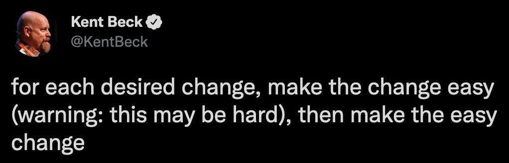 Je größer die vorgenommene Änderung ist, desto mehr dieser Tipps werden dafür hilfreich sein. Für das Ersetzen von ein bis drei Vorkommnissen in einer kleinen Datei ist das Vorgehen jedoch häufig übertrieben bzw. besser mit der Suchen-&-Ersetzen-Funktion im einzelnen Datei-Tab zu erledigen. Falls du eine große Änderung in mehreren Schritten im Zuge eines Refactorings durchführst, beinhaltet dieser Tweet von Kent Back eine hilfreiche Weisheit: