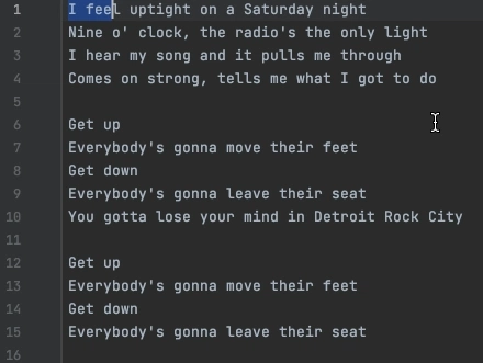 Diese Funktion moderner IDEs ermöglicht es, mehrere aktive Cursor in der offenen Datei zu platzieren. Diese Cursor verhalten sich beim Eingeben oder Löschen von Text identisch. Das kommt einer visuellen, interaktive Art von „Suchen & Ersetzen“ in einer einzelnen Datei gleich. Es ist empfehlenswert, wenn „Suchen & Ersetzen“ nicht in Frage kommt, weil der zu bearbeitenden Text nicht über ein triviales Textmuster auffindbar ist.