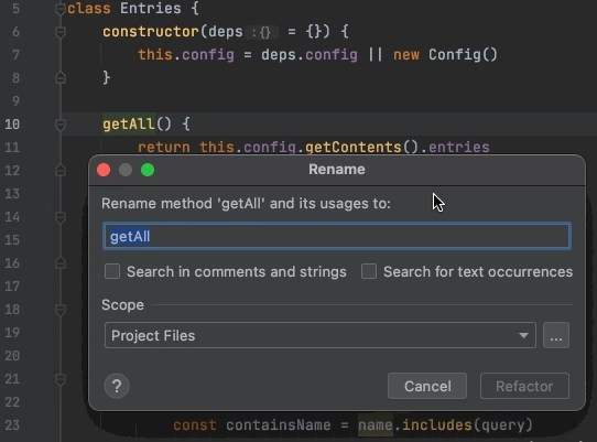 IDEs sollten beim Umbenennen von Dateien, Klassen, Eigenschaften und Variablen unterstützen. Mit einer geeigneten „Umbenennen“-Funktion können alle Verwendungen eines Symbols auf einmal bearbeitet werden. Damit das funktioniert, muss die IDE in der Lage sein, Abhängigkeiten und Verwendungen zwischen Dateien und Symbolen innerhalb des Codes zu erkennen. Das funktioniert am besten mit typisierten Sprachen für die von der IDE oder Plugins die nötige Unterstützung angeboten wird. Der Aufruf von „Umbenennen“ per Tastenkombination ist bei IntelliJ IDEA und anderen JetBrains IDEs „Shift + F6“.