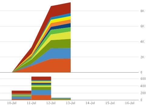 Abgebildet sind die Zeilen selbstgeschriebenen Codes über Zeit. Man sieht den schnellen Wachstum der Zeilenzahl. Es sieht also nach einem sehr produktivem Projekt auch. Die Verteilung des Codes auf die Entwickler ist interessant, man ist fast geneigt zu sagen: 20% der Entwickler haben 80% des Codes geschrieben. Allerdings relativiert sich dies etwas dadurch, daß die Anwesenheit an dem Wochenende stark schwankte. Die 4-6 stärksten Balken verteilen sich somit auch auf die Entwickler welche fast permanent anwesend waren. Eine Anmerkung am Rande: Letzendlich ist es doch erschreckend, wie viel Code für relativ wenig Funktionalität benötigt wurde. Diesen Kritikpunkt muss Java leider einstecken.