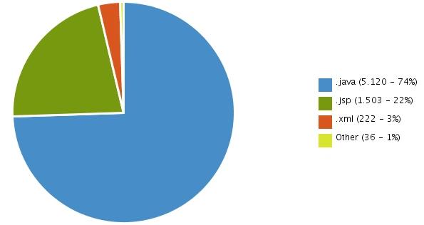 Das Tortendiagramm zeigt es deutlich. Wir haben hauptsächlich Java code geschrieben. JSPs wurden als Views genutzt. XML ist kaum vorhanden, da wir größtenteils Annotations verwendet haben anstelle von langen Spring Konfigurationen. Ausgeblendet aus dieser Ansicht sind Javascriptbibliotheken welche eingebunden wurden aber im src Verzeichnis liegen und damit von FishEye als unser Code gezählt wird. Auch zeigt die Verteilung, daß relativ wenig untestbarers entstanden ist. Ausser den Views, welche in egal welcher Form immer problematisch sind, ist fast der komplette Code mit Java Mitteln testbar.