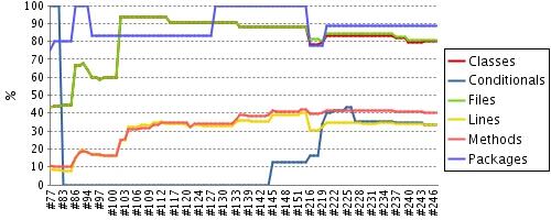 Der Graph ist auch sehr aufschlussreich, so erkennt man daß die Testabdeckung sehr breit ist, da etwa 90% aller Klassen und Packages abgedeckt wurden. Daß die „Conditionals“ rapide fielen hatte den Grund, daß die Software in der Tat bis Build 83 keine If Verzweigung enthielt. Dies spricht für eine sehr geringe Komplexität, welches der Verwendung von Spring anzurechnen ist, da man selber keine Verzweigungen programmieren muss wenn man immer die richtigen Objekte vom Container übergeben bekommt. Zwar versuchte man dann auch später implementierte Verzweigungen abzudecken, war aber nicht wirklich erfolgreich. Dies liegt meiner Meinung nach daran daß die Verzweigungen durch Fehler/Exception Handling entstehen und nicht so schön testbar sind. Die steigende Methoden und Zeilenabdeckung ist gut, aber insgesamt viel zu niedrig. Die Ursachen dafür sind allerdings nachvollziehbar. So schlagen sich vorbereitete aber nicht genutzte Services (toter code) durch. Auch die Modellklassen und unzählige Getter und Setter sind teilweise nicht extra getestet.