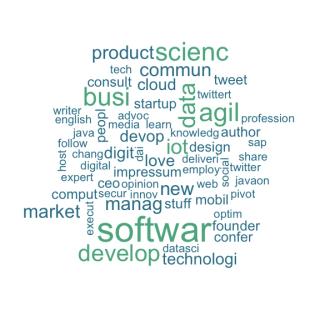 Nicht überraschend finden wir software, development, agil und business unter den häufigsten Wörtern. Aber auch IoT (Internet of Things), data und science werden häufig in den Profilbeschreibungen unserer einflußreichen Follower genannt!