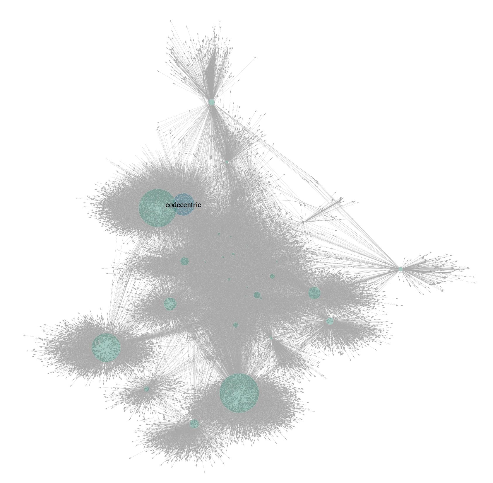Soziales Netzwerk von codecentric’s Twitter Freunden und Followern. Knotengröße entspricht “betweenness” Zentralität.
