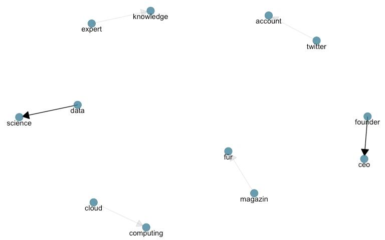 Diese Abbildung zeigt die am häufigsten vorkommenden Wortpaare in den Profilbeschreibungen unserer einflußreichsten Follower. Pfeilfarben entsprechen der Häufigkeit. Da wir nur eine relativ kleine Gruppe an Followern analysieren, kommt keines der Wortpaare extrem häufig vor. Nichtsdestrotz ist “data science” das am meisten vorkommende Wortpaar!
