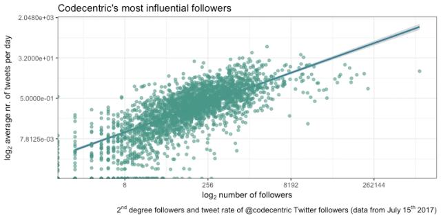 Die Abbildung oben zeigt die Korrelation zwischen der Anzahl an Followern von codecentric’s Followern und die Häufigkeit, mit der sie tweeten.