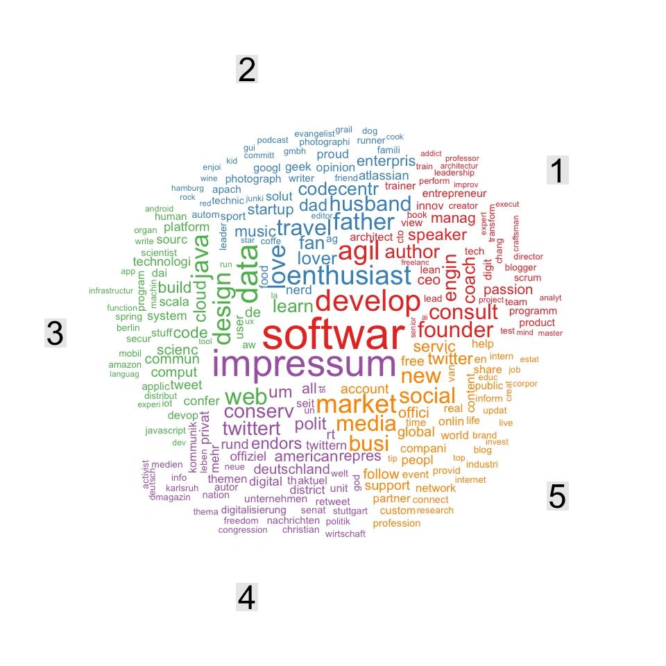 Im nächsten Schritt können wir mit Topic Modeling auf Basis der Profilbeschreibungen unsere Follower Themengruppen mit ähnlichen Interessen zuordnen. Eine umfassende Einführung in Topic Modeling kann in Matthias Radtke’s “Topic Modeling of the codecentric Blog Articles” nachgelesen werden.