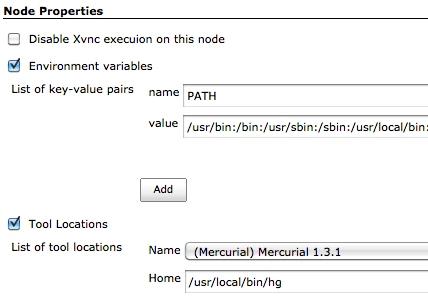 Da der Slave später in der Lage sein muss auf das Source Code Repository zuzugreifen, ist es sinnvoll die dazu notwendigen Umgebungsvariablen und Pfade zu den benötigten Tools in den „Node Properties“ zu konfigurieren. Diese Einstellungen hängen jeweils von den Gegebenheiten des Slaves und dem verwendeten Versionsverwaltungssystem ab: