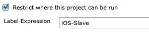 Für alle iOS Projekte ist es wichtig anzugeben, dass die Builds immer auf dem zuvor eingerichteten iOS-Slave ausgeführt werden. Dazu die Option „Restrict where this project can be run“ setzen und als „Label Expression“ den Namen des Nodes eingeben, der auf einem Mac läuft.