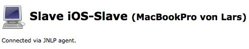 Wurde der Slave auf dem Master nicht iOS-Slave genannt muss der Wert des Paramters jnlpUrl dementsprechend angepasst werden. Die zu verwendende jnlpUrl kann auf dem Master untern den Eigenschaften des Nodes ausgelesen werden (unter „Manage Jenkins/Manage Nodes/iOS-Slave“). Ist der Start des Nodes erfolgreich verlaufen, wird auf der Übersichtsseite im Master der Status „Connected via JNLP agent“ gemeldet: