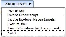 Der eigentliche Build der iOS Software wird dann als Build Step hinzugefügt. Durch die Installation des XCode Integration Plugin steht in der Auswahlliste unter „Add build step“ die zusätzliche Option „XCode“ zur Verfügung, die dazu verwendet wird.