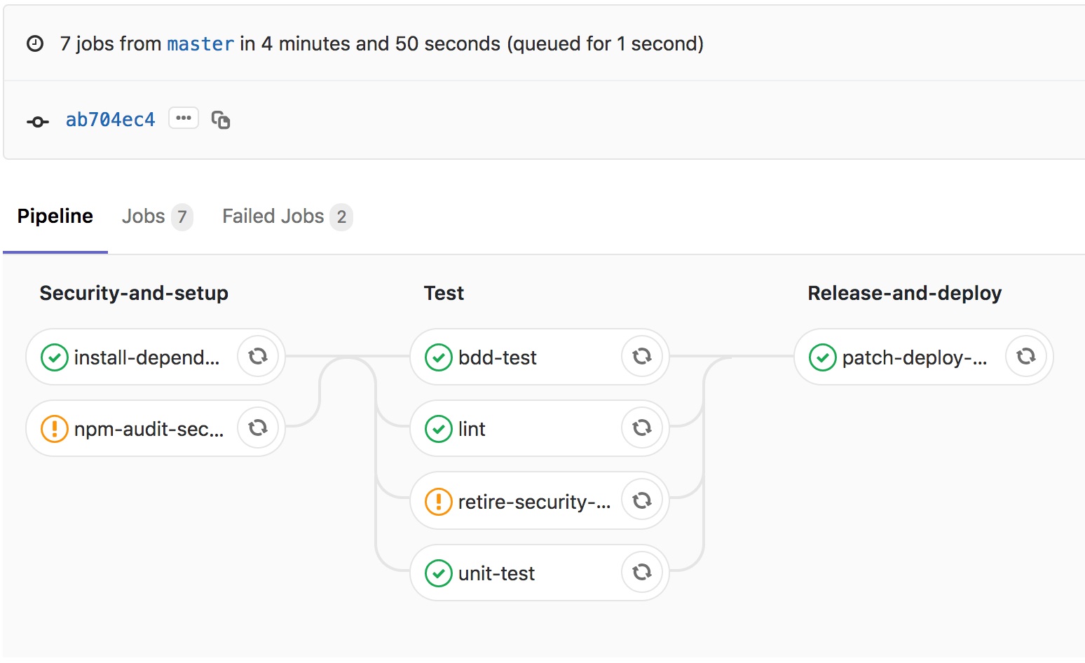 Als nächstes wartet die Implementierung der Test-Stage mit den Jobs für Retire, Linting, Unit-Tests und BDD-Tests. Auch hier lernt man als JavaScript-Entwickler leider nicht mehr viel Neues: