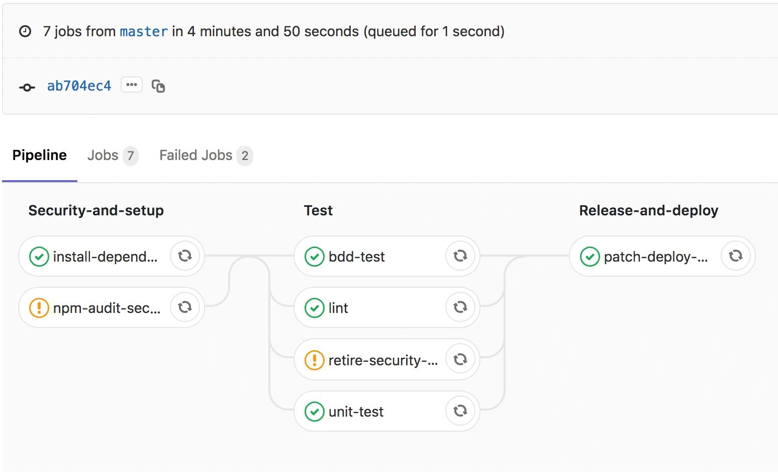 Diese zwei Jobs lassen sich einfach lesen und verstehen. Die Dependencies werden installiert und parallel auf bekannte Sicherheitslücken geprüft. Am Ende von install-dependencies