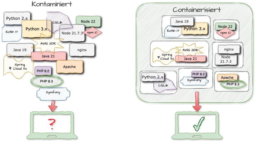 Isolation - Die Entwicklungsumgebung nicht “vollmüllen” mit Installation unterschiedlicher Tools und Versionen aus unterschiedlichen Projekten (z.B. Python 2 und 3 Projekte oder der ganze Node.js Module-Zoo etc.). Das ist aber kein neues Thema: Vor dem Aufkommen der Container war diese Isolation durch Auslagerung der Projekte in Virtuelle Maschinen auf den Entwicklungsrechnern üblich. Oder noch früher unter Unix/Linux für Command Line Junkies mit chroot