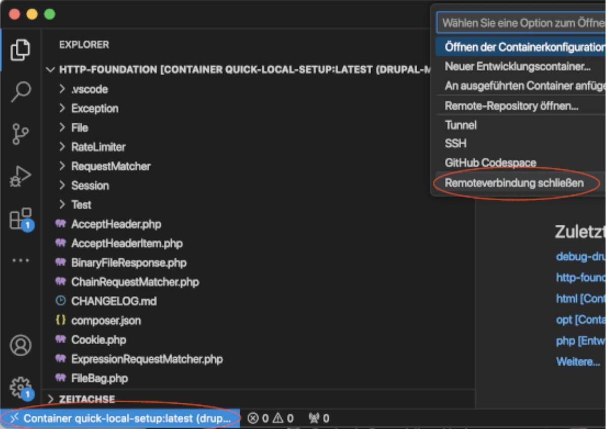 VS Code arbeitet jetzt innerhalb des Dev Containers drupal-min-setup-debug-php-1