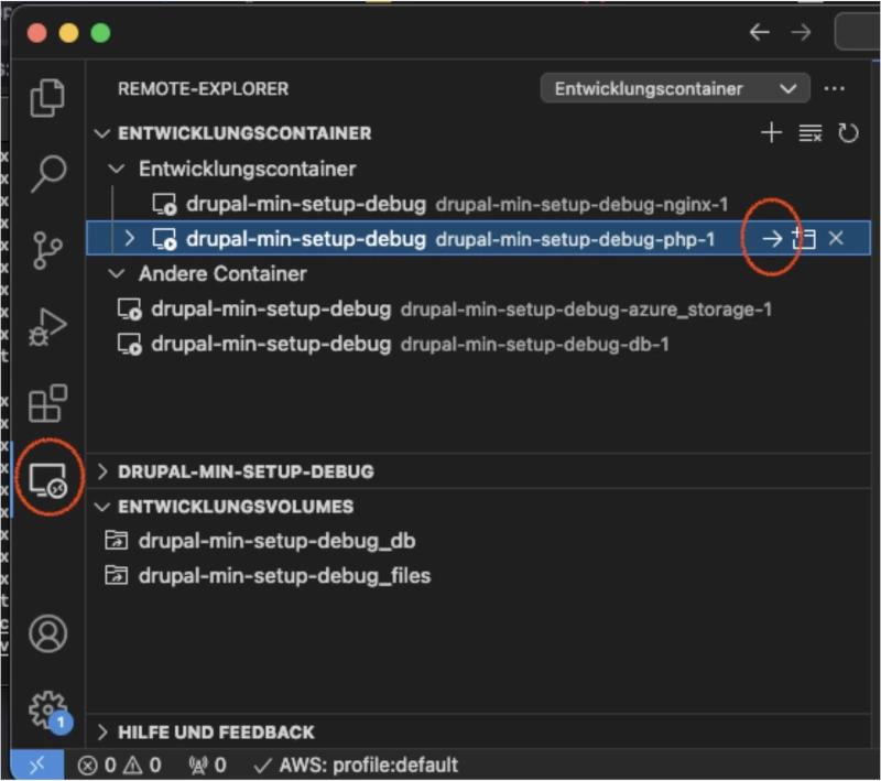 Symbol klicken (Icon in der linken Leiste unterhalb "Extensions") und dann mit dem Container drupal-min-setup-debug-php-1